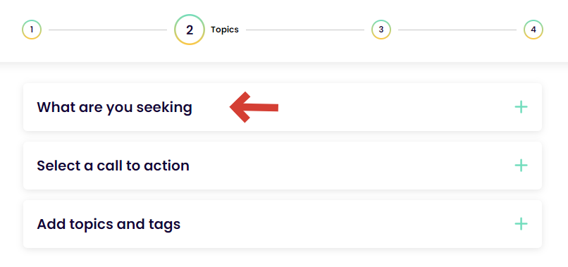 4. Next you will pick the tags and topics you'd like to use to describe your story. The "seeking" tag lets the community know what kinds of replies you'd like to receive. .png)